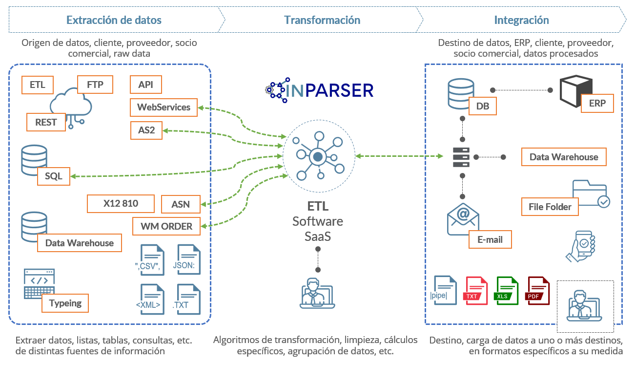InPARSER: es una herramienta de software de sincronización ETL que funciona como motor de captura de información de orígenes establecidos a la medida, para transformar e insertar información local dentro de su red, hacia la plataforma LAN, WAN, Internet, hardware u orígenes específicos, de interoperabilidad, basados en requerimientos que se ajustan a la medida.